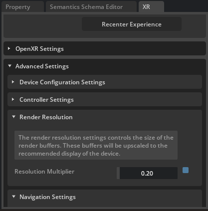 If the simulation runs at too low FPS and makes the teleoperation feel laggy, you can try to reduce the XR resolution from the XR tab / Advanced Settings / Render Resolution.