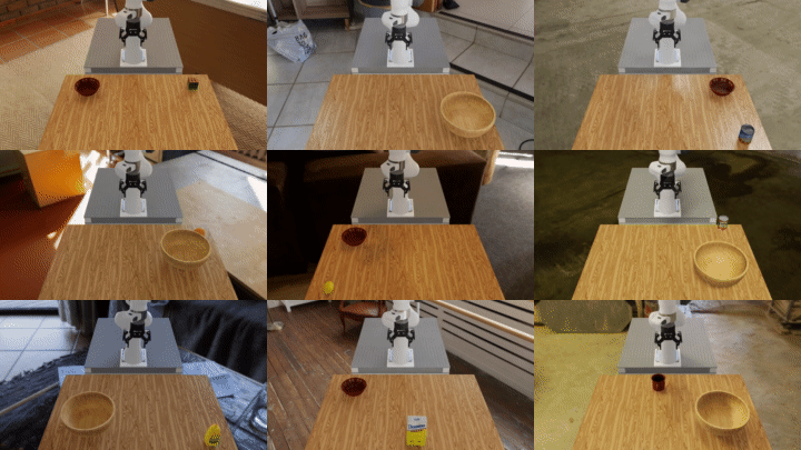 9 closed-loop evaluation runs of GR00T N1.6 on the DROID embodiment — each cell varies the pick-up object, background HDR, and destination.#