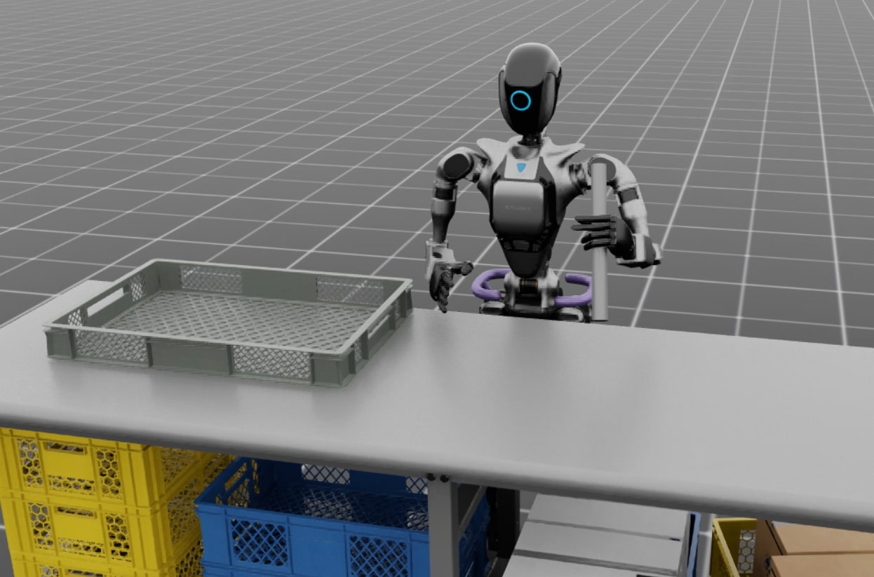 Pick up and place an object in a basket with a Unitree G1 humanoid robot with three-fingered hands. Robot is set up with the base fixed in place. |