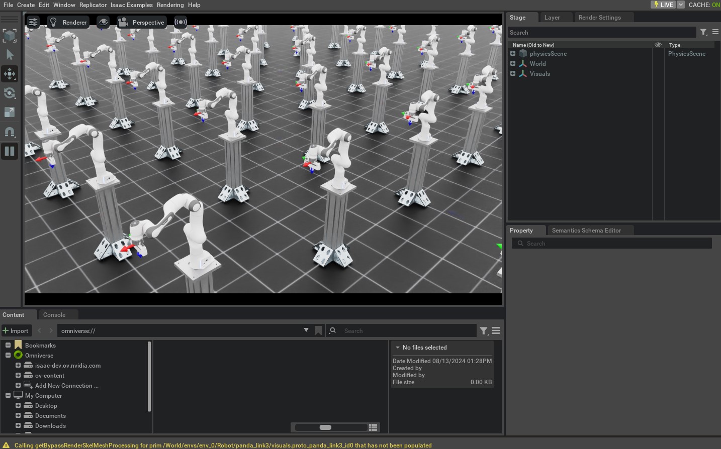 The script will start a simulation with 128 robots. The robots will be controlled using the IK controller. The current and desired end-effector poses should be displayed using frame markers. When the robot reaches the desired pose, the command should cycle through to the next pose specified in the script.